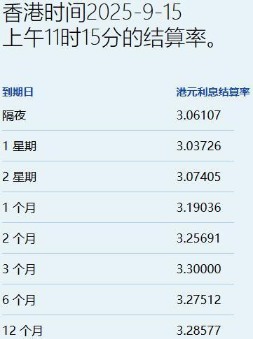 智通财经APP获悉,9月15日,港元拆息再度上扬,而与楼按相关的一个月拆息连升两日配资炒股配资开户,报3.19036%,升2.84基点,为8月29日后最高;反映银行资金成本的三个月拆息报3.3%,升7.827基点。