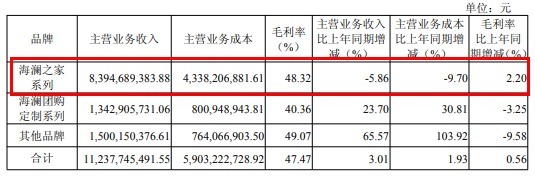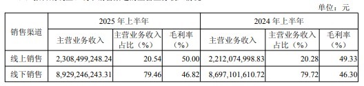 渠道优化已初见成效。尽管主品牌营收同比下降5.86%,但公司整体营收仍实现1.73%的增长,达到115.66亿元。线上渠道表现尤为亮眼,23.08亿元的收入毛利率较去年同期提升0.67%,稳住50%,占总营收比重提升至20.5%。