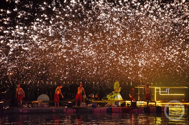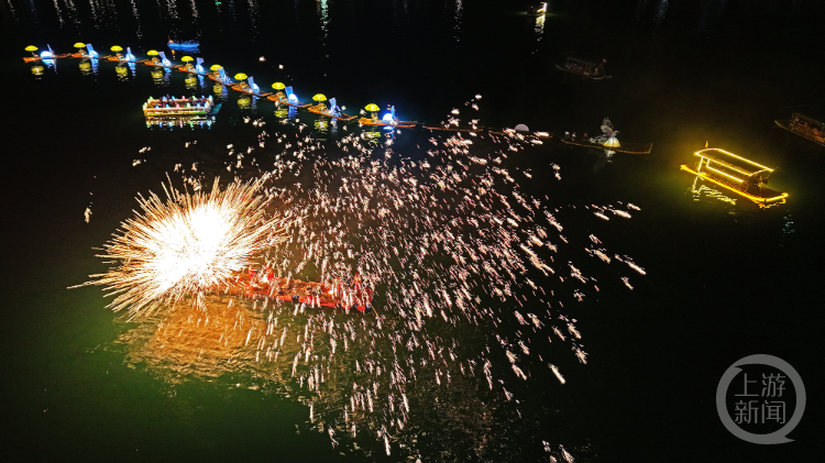 随着夜色渐浓,古镇的夜空被非遗绝技彻底点亮。古老技艺“打铁花”震撼登场,非遗代表性传承人将滚烫的铁水奋力击打,瞬间万千金丝划破夜空,洒下漫天“繁星”。