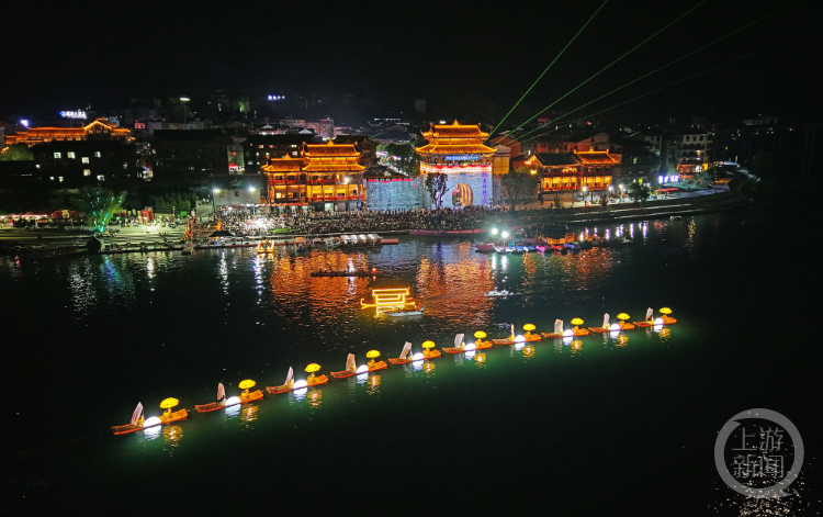 夜幕降临,濯水古镇灯火璀璨。阿蓬江上,十余艘“鹊桥船”连缀成一条金色长龙,蜿蜒盘桓于水面。光影交织间,古朴的风雨廊桥与土家吊脚楼群倒映在粼粼波光上,宛如一幅流动的鎏金画卷,为游客奉上一场美不胜收的视觉盛宴。